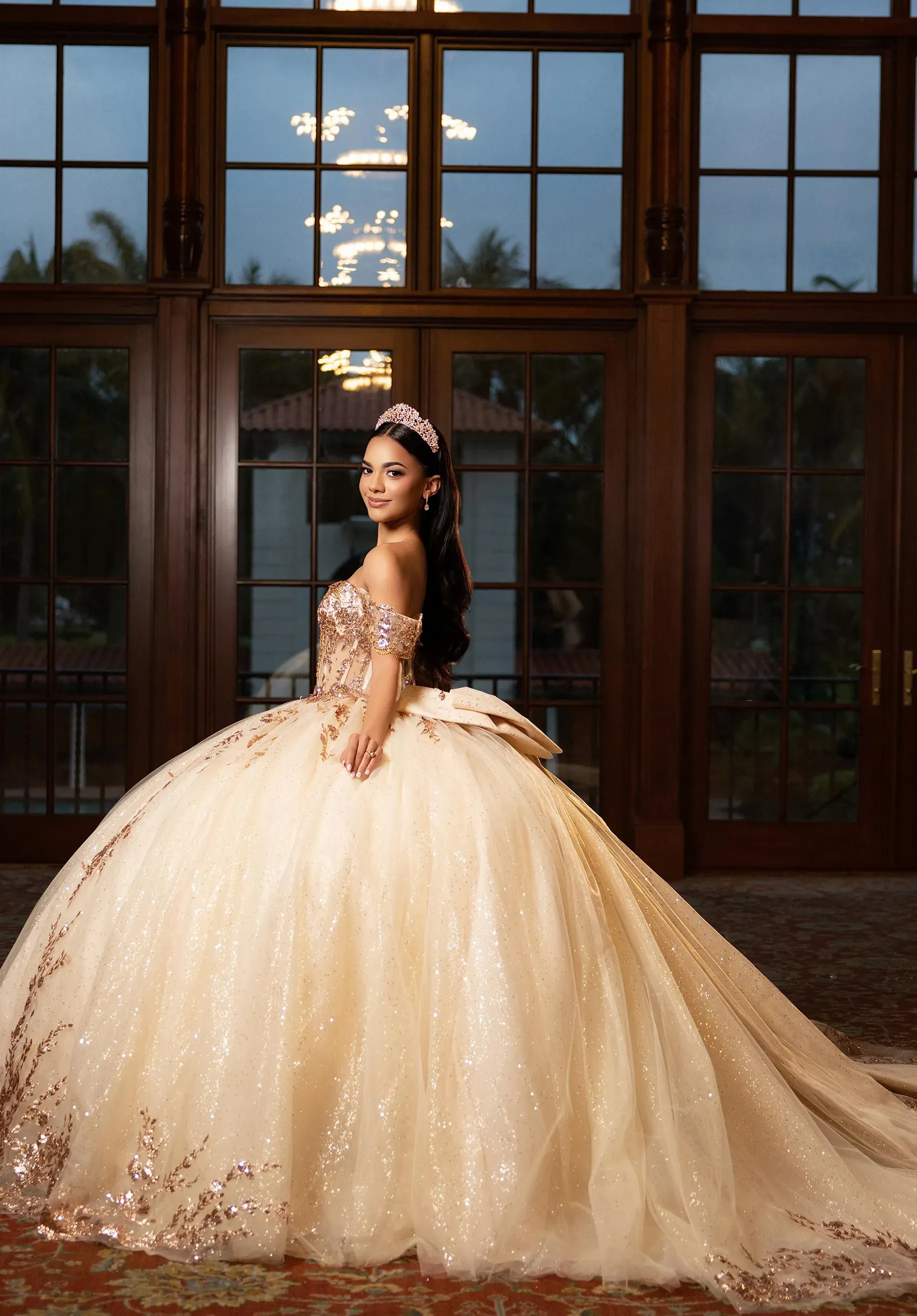 Our Aliea Quinceanera dress radiates modern elegance in glitter tulle with metallic beaded floral appliqués that have a gilded look. The sweetheart neckline and sheer midriff are framed by structured boning for classic corset bodice with a lace-up back and a a show-stopping double-loop appliqué bow. The detachable off-the-shoulder sleeves that let you switch up your style, off-the-shoulder for your grand entrance and strapless to dance the night away.