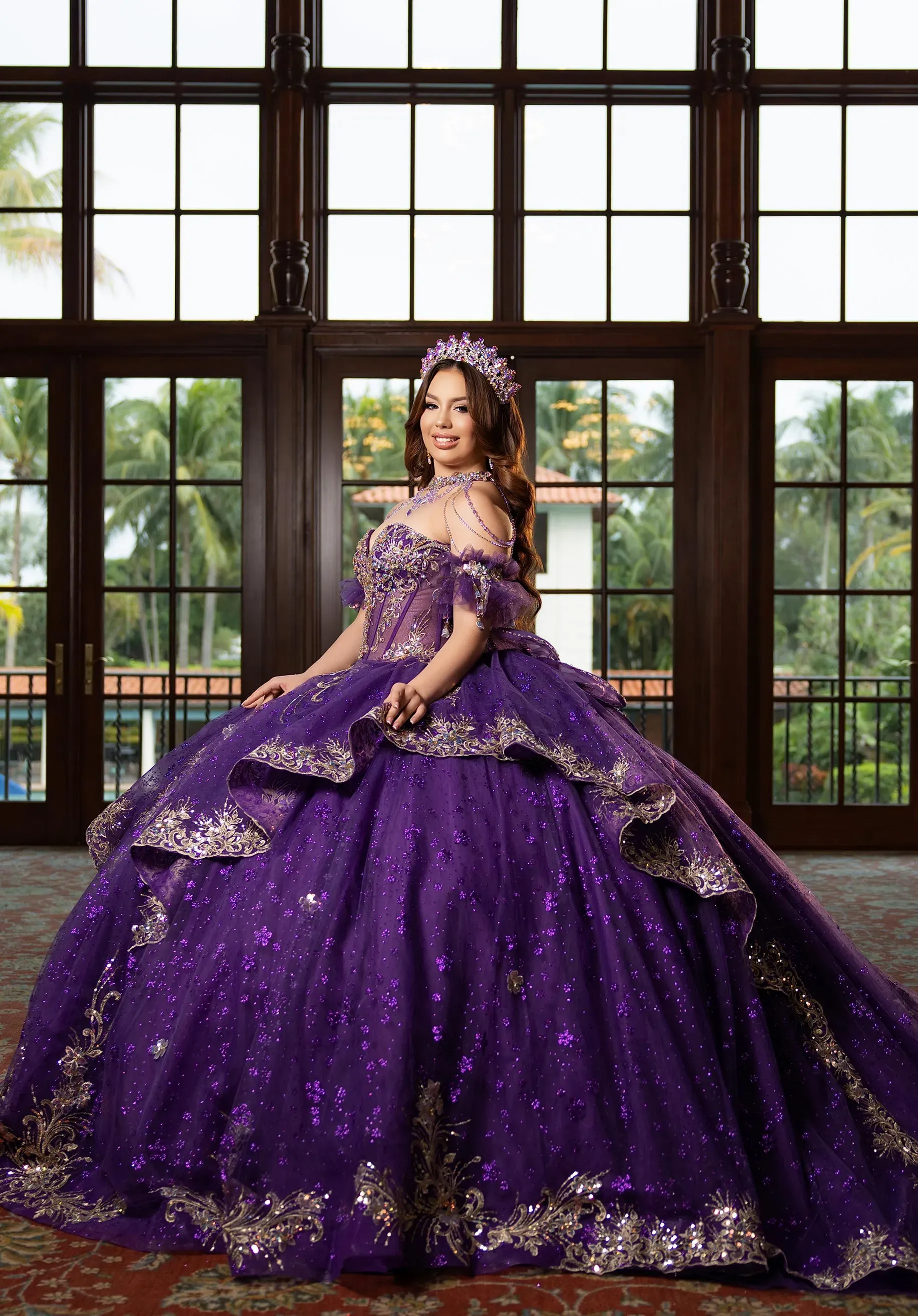 Get ready for main-character magic in our Brianna quinceañera dress. This glitter tulle stunner features a sheer, boned bodice with an exaggerated sweetheart neckline that feels daring yet ultra-romantic. Style it your way with a detachable crystal and pearl draped choker and matching crystal-embellished sleeves for extra sparkle. The basque waist flows into a cascading ruffle skirt, shimmering with sequin lace appliqués that dazzle from every angle. Finished with a detachable floral back bow, Brianna is the perfect blend of drama, glamour, and customizable couture.