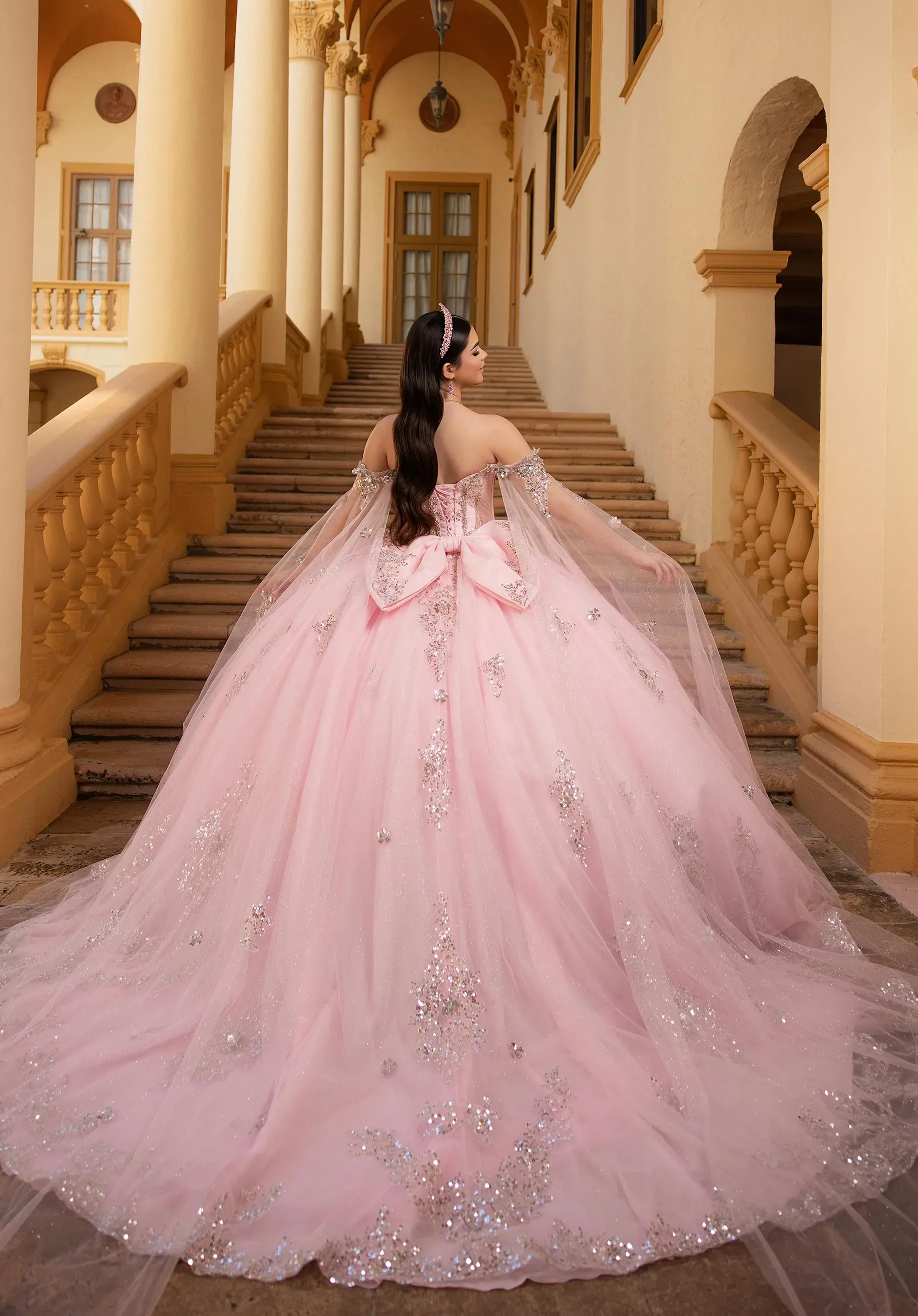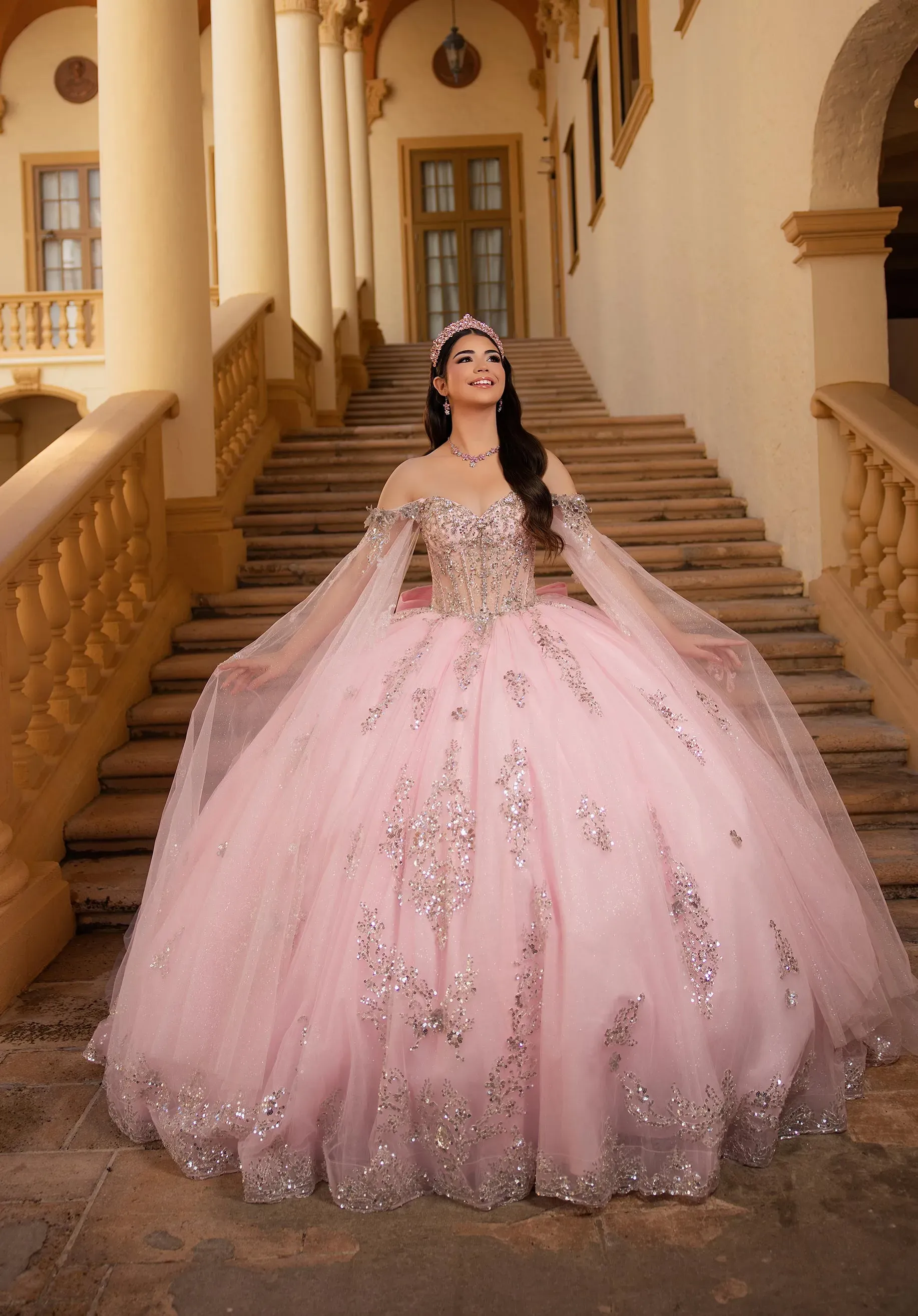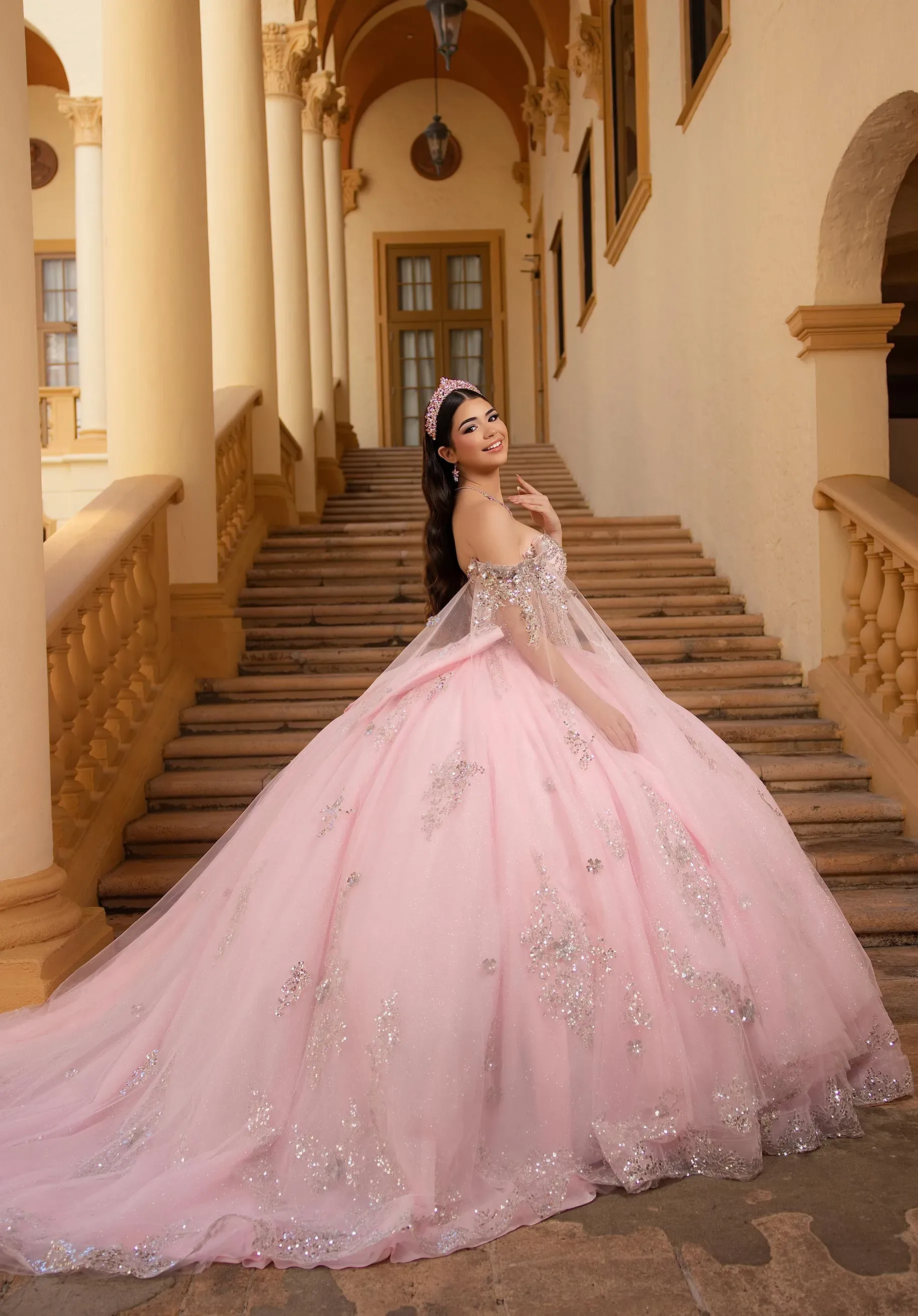 Step into sparkling elegance with our Bianca quinceañera dress. The sheer corset bodice dazzles with sequin and beaded floral lace, framed by a romantic sweetheart neckline and detachable off-the-shoulder angel sleeves for drama and versatile style. The basque waist flows into a full glitter tulle ball gown skirt, adorned with cascading sequin and beaded floral lace that sparkles from every angle. A detachable back bow completes this enchanting look, perfect for the quinceañera who wants timeless glamour with a modern twist.