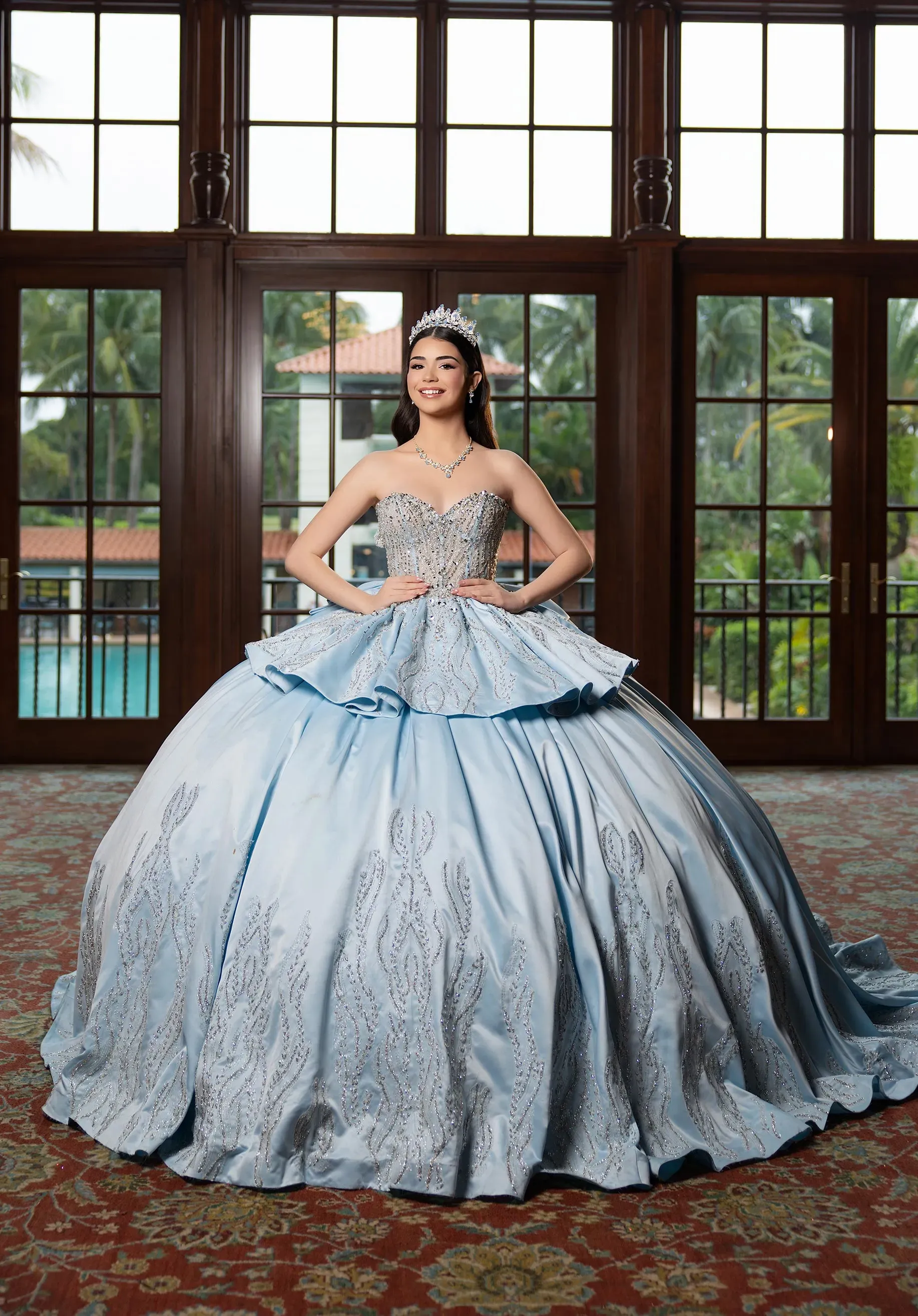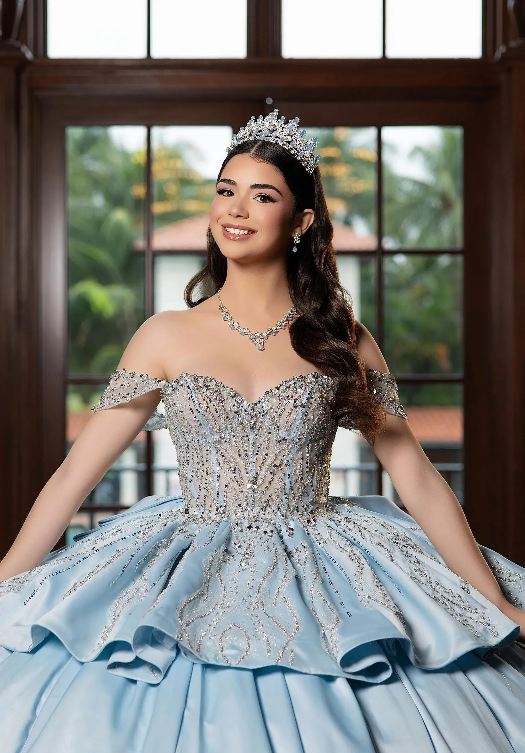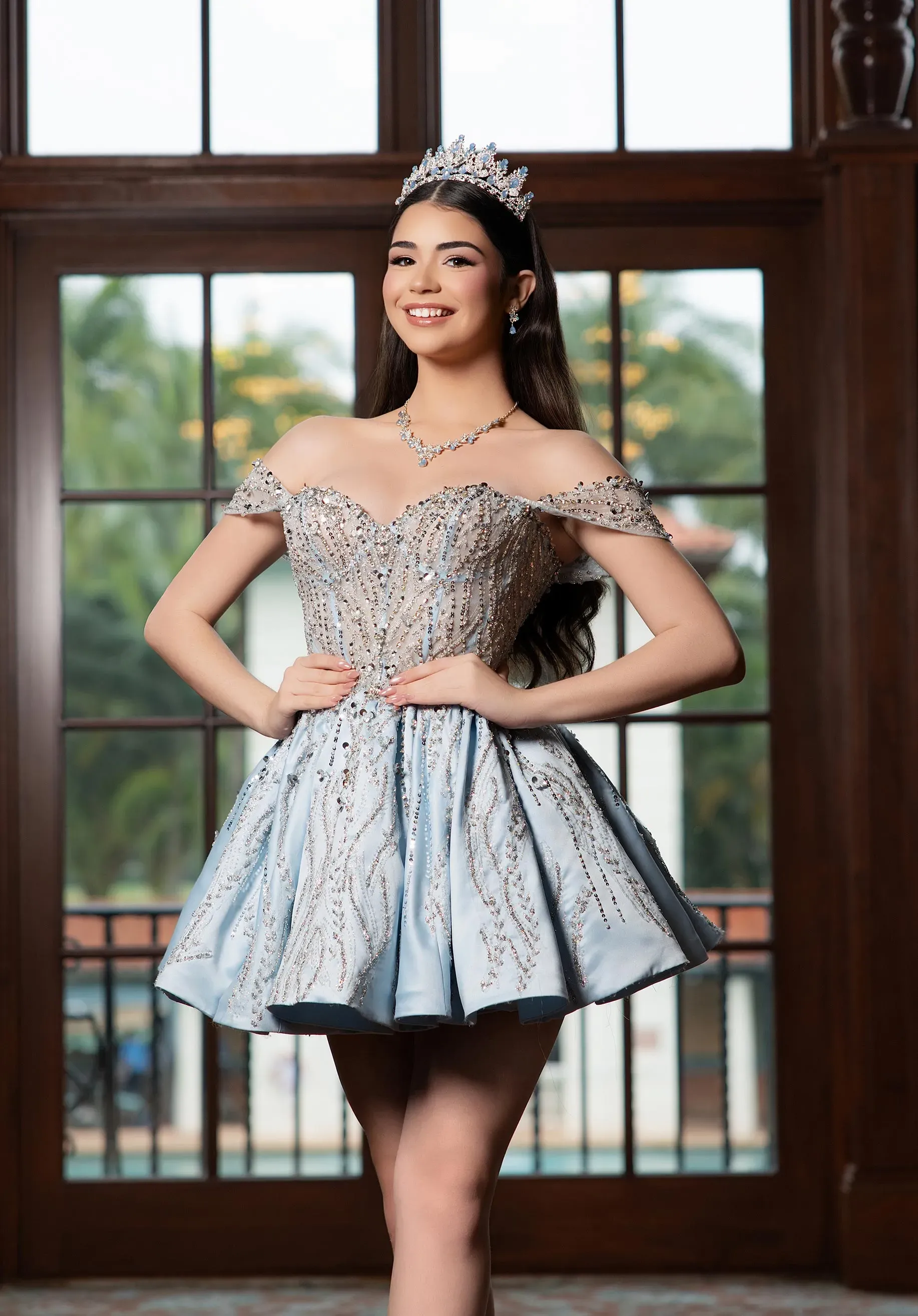Shine from every angle in our Benny quinceañera dress, a two-in-one design made for the modern quince girl. The satin A-line mini dress features a sheer, crystal-encrusted corset bodice with detachable off-the-shoulder sleeves, combining sparkle and elegance in a playful silhouette. Transform the look with the detachable glitter tulle ball gown skirt, which creates layered peplum detail from the mini and completes the ensemble with a matching detachable back bow, perfect for a quinceañera who loves both chic party style and full princess glamour.